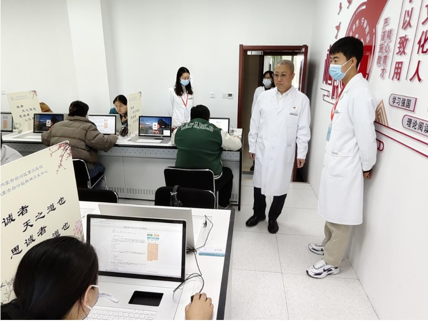 11月6日上午,按照自治区统一部署采用人机对话方式完成两场理论考试。下午,在实践技能室完成2021级临床实践技能考试。本次临床实践技能考试采取多站式方式,包括心肺复苏、基本技能操作、辅助检查判读、精神科技能考试。11月7日上午,在实践技能室完成2022级临床实践技能考试。