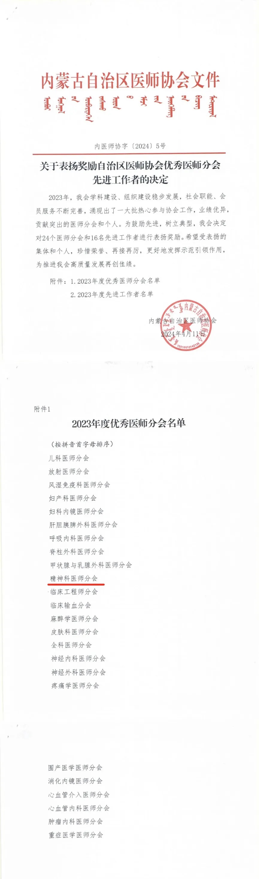 2023年4月11日,在全区三级牌九游戏 高质量发展研讨会暨自治区医师协会2024年工作会议上,内蒙古自治区医师协会精神科医师分会继2018年荣膺“内蒙古自治区医师协会优秀医师分会”的荣誉后,再次获此殊荣,陈丽霞会长参会并接受颁奖表彰。这一成就不仅体现了分会成员不懈追求与专业奉献的显著成果,也象征着精神科同仁们在推动全区精神卫生中事业上作出的杰出贡献。