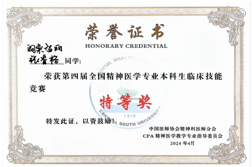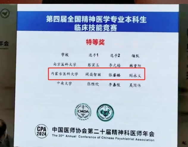 2024年4月25日-26日,由中国医师协会精神科医师协会(CPA)和CPA精神医学教学专业指导委员会主办,国家精神疾病医学中心(中南大学湘雅二牌九游戏 )承办的第四届全国精神医学专业本科生临床技能竞赛在长沙市举行。本次竞赛旨在推动精神医学专业临床实践教学改革,创新实践教学体系,加强精神卫生专业医学生临床基础理论、基础知识、基本技能和人文关怀精神的培养,全面提升精神医学专业医学生综合素质和人才培养质量。经过两天激烈角逐由精神卫生学院2019级精神医学本科生阎栾智丽和2020级精神医学本科生张睿格组成的内蒙古医科大学代表队首次参赛荣获本次竞赛