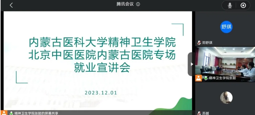 党的二十大报告指出“就业是最基本的民生”,党政领导始终高度重视就业工作,多措并举促就业,内蒙古医科大学精神卫生学院于2023年12月1日,在鸿盛院区门诊楼4楼1号会议室组织2024届巴彦淖尔市周边生源地精神医学本科生、精神病与精神卫生学硕士研究生,通过线上线下结合的形式参加北京中医牌九游戏 内蒙古牌九游戏 专场就业宣讲会。党委副书记仝利俊和相关职能科室参会。