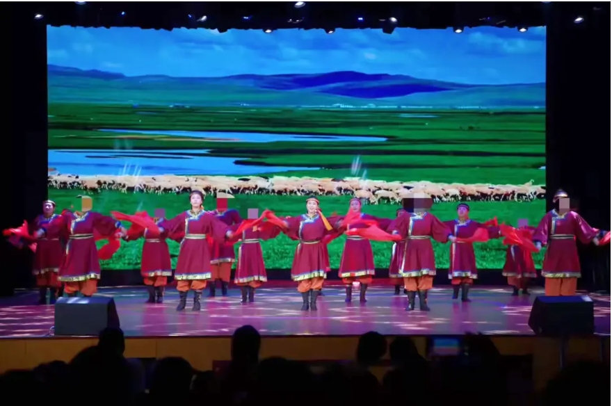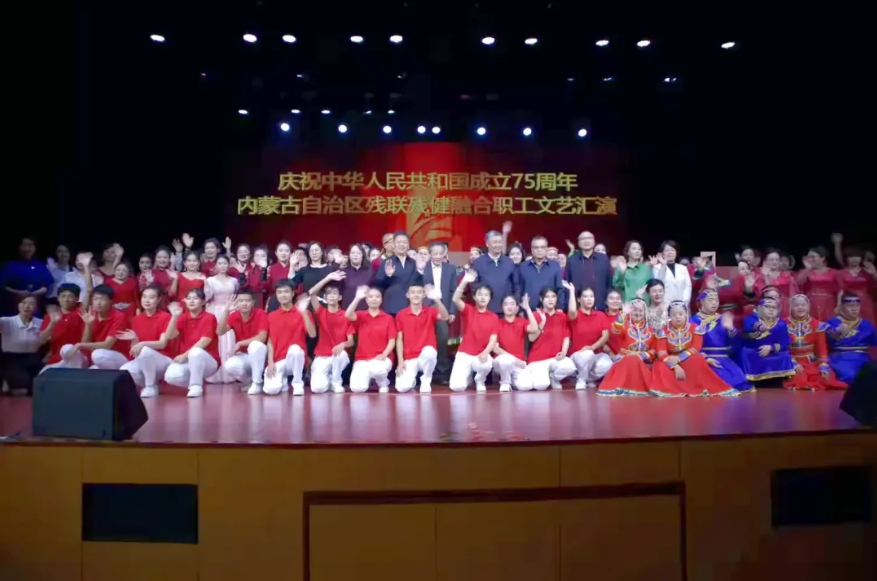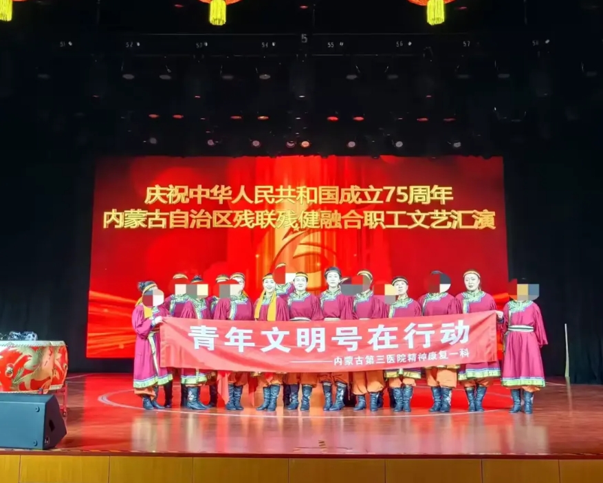 为献礼祖国75 周年华诞,唱响新时代爱党爱国爱人⺠ 的主旋律,残联举办庆祝中华人⺠共和国成立 75 周年内蒙古自治区残联残建融合文艺汇活动,牌九玩法研究所 精神康复一科的康复师和社区康复者共同编排的安代舞《欢庆》参加演出,表达对祖国的热爱和祝福。
