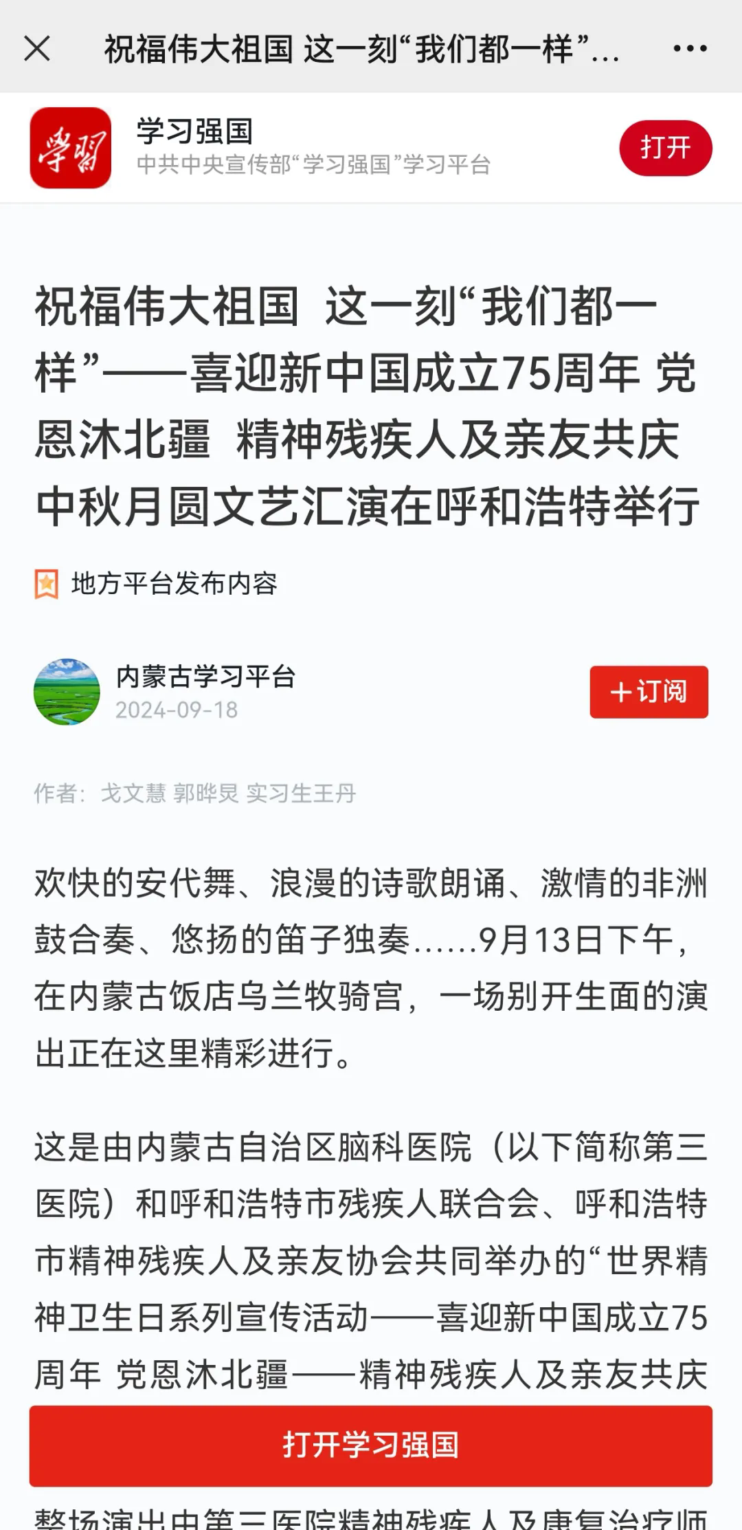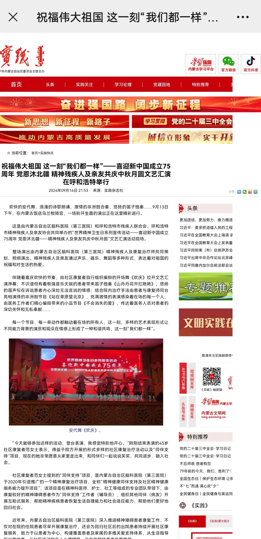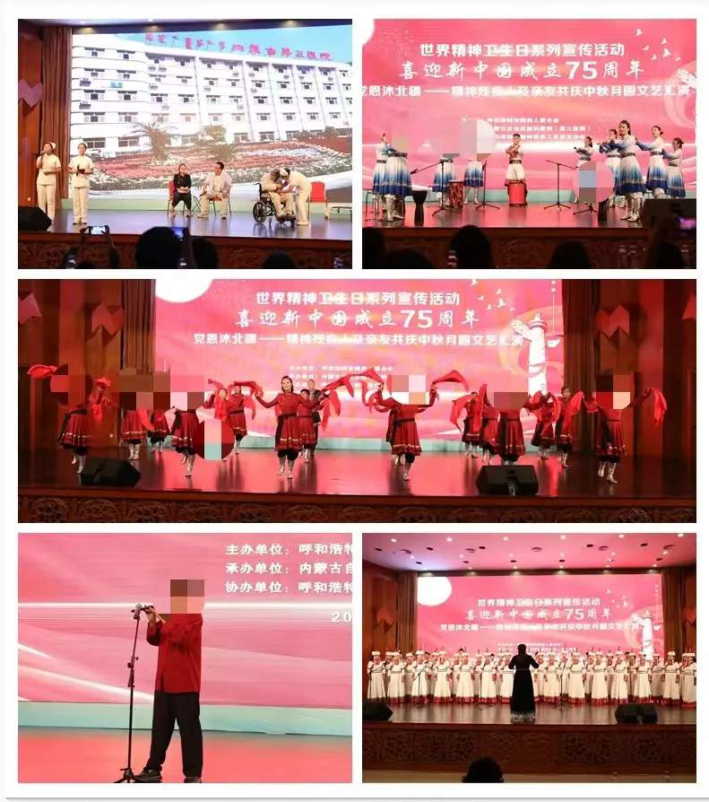 2024年9月13日下午由牌九玩法研究所 和呼和浩特市残疾人联合会、呼和浩特市精神残疾人及亲友协会共同举办的“世界精神卫生日系列宣传活动-喜迎新中国成立75周年,党恩沐北疆——精神残疾人及亲友共庆中秋月圆”文艺汇演活动在内蒙古饭店成功举办。文艺汇演在庆祝中华人民共和国成立75周年及中秋佳节的同时也展现了精神残疾人及其亲友的才华和精神风貌。此次活动获得学习强国和实践杂志相继报道。