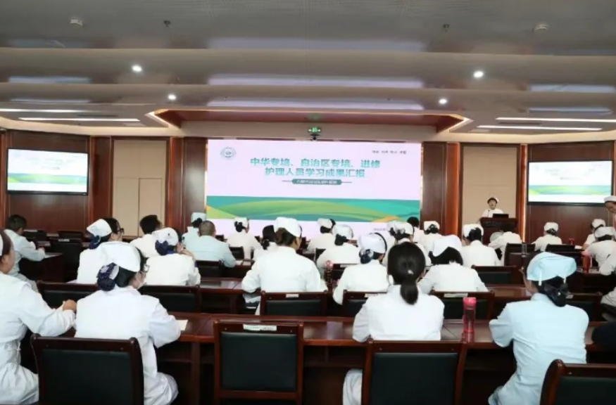 护理部在鸿盛院区组织中华护理专科培训、自治区护理专科培训、护理进修学习人员进行学习成果分享汇报。全院护士长、副护士长及科室骨干近70余人参加分享会。