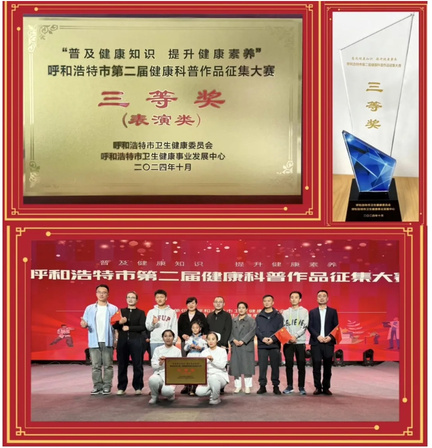 2024年10月29日,由牌九玩法研究所 护理部选送的原创健康科普情景剧作品《不会消失的爱》参加呼和浩特市卫生健康委主办的“普及健康知识 提升健康素养”呼和浩特市第二届健康科普作品征集大赛表演类作品展演大赛,在16支决赛队伍中脱颖而出,荣获表演类三等奖。