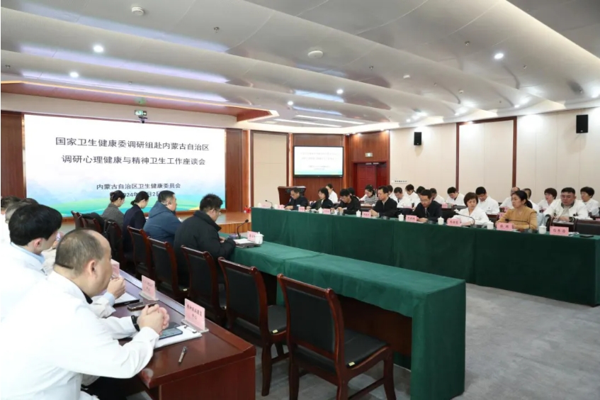 (鸿盛院址)门诊楼四楼会议室对内蒙古自治区心理健康和精神卫生工作进行调研,内蒙古自治区卫生健康委副主任隋晓杰、内蒙古自治区卫生健康委医政处处长阿斯楞、内蒙古自治区卫生健康委医政处卫生监察专员张颖等陪同。内蒙古自治区卫生健康委医政处处长阿斯楞主持会议。