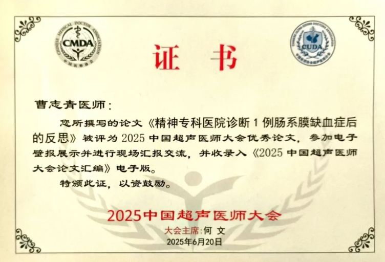 超声科长期致力于精准诊疗与科研创新并行发展,依托先进超声设备,覆盖腹部、心血管、浅表器官,肌骨超声等多系统常规检查,更聚焦精神与神经专科患者躯体共病特点,探索超声在精神与神经疾病患者长期服药监测、合并症早期筛查中的应用潜力。此次论文获奖,正是科室重视临床案例积累、鼓励医师学术探索的成果体现。